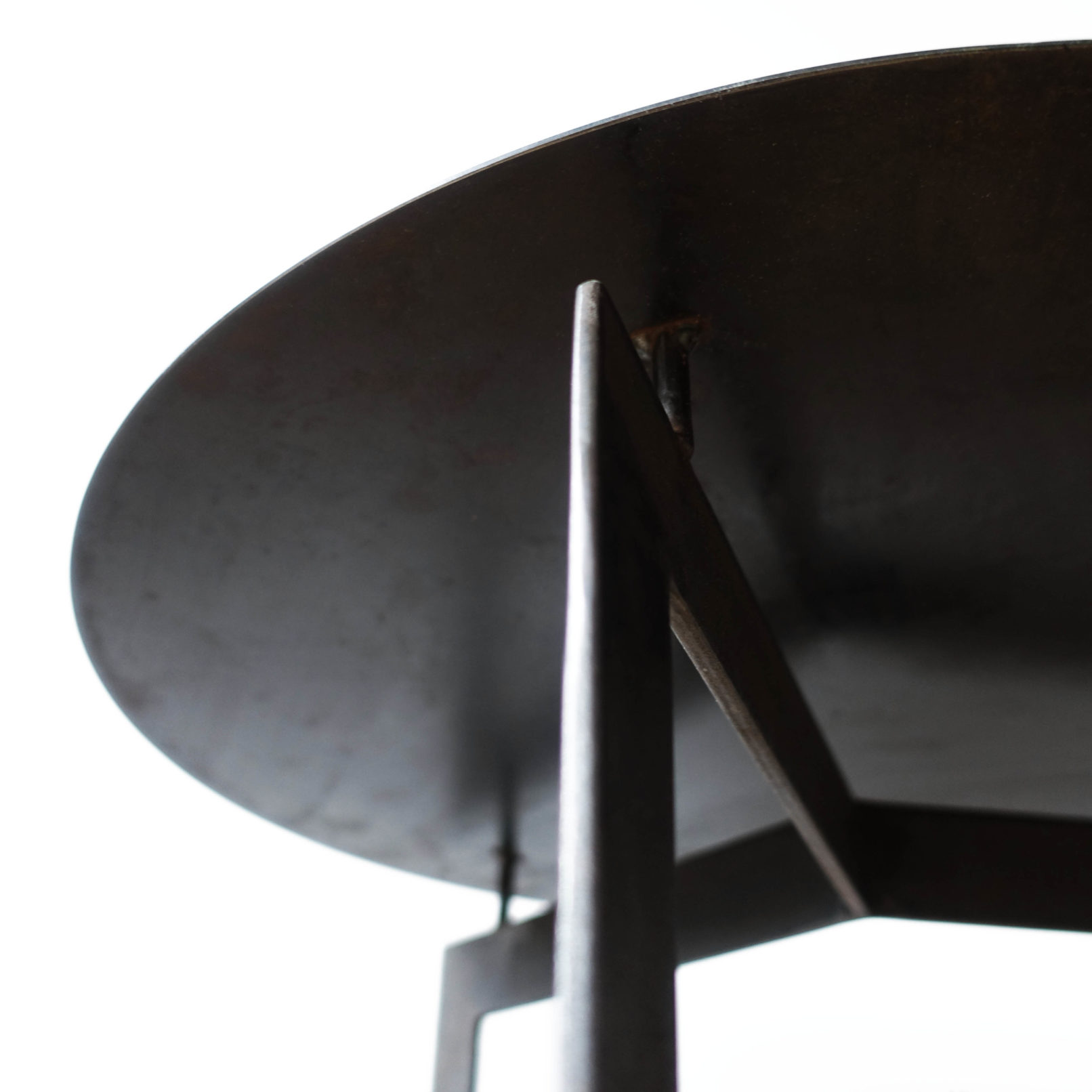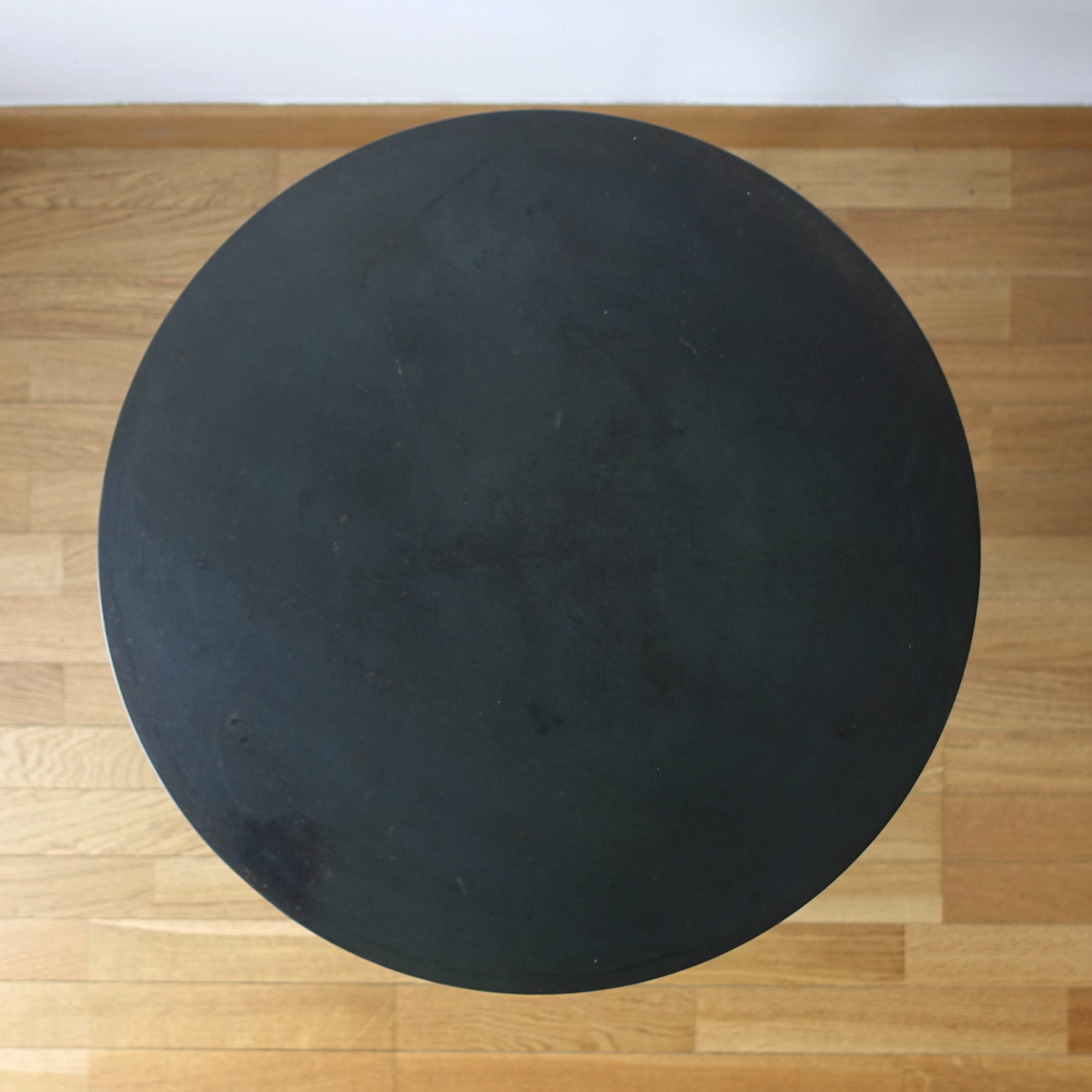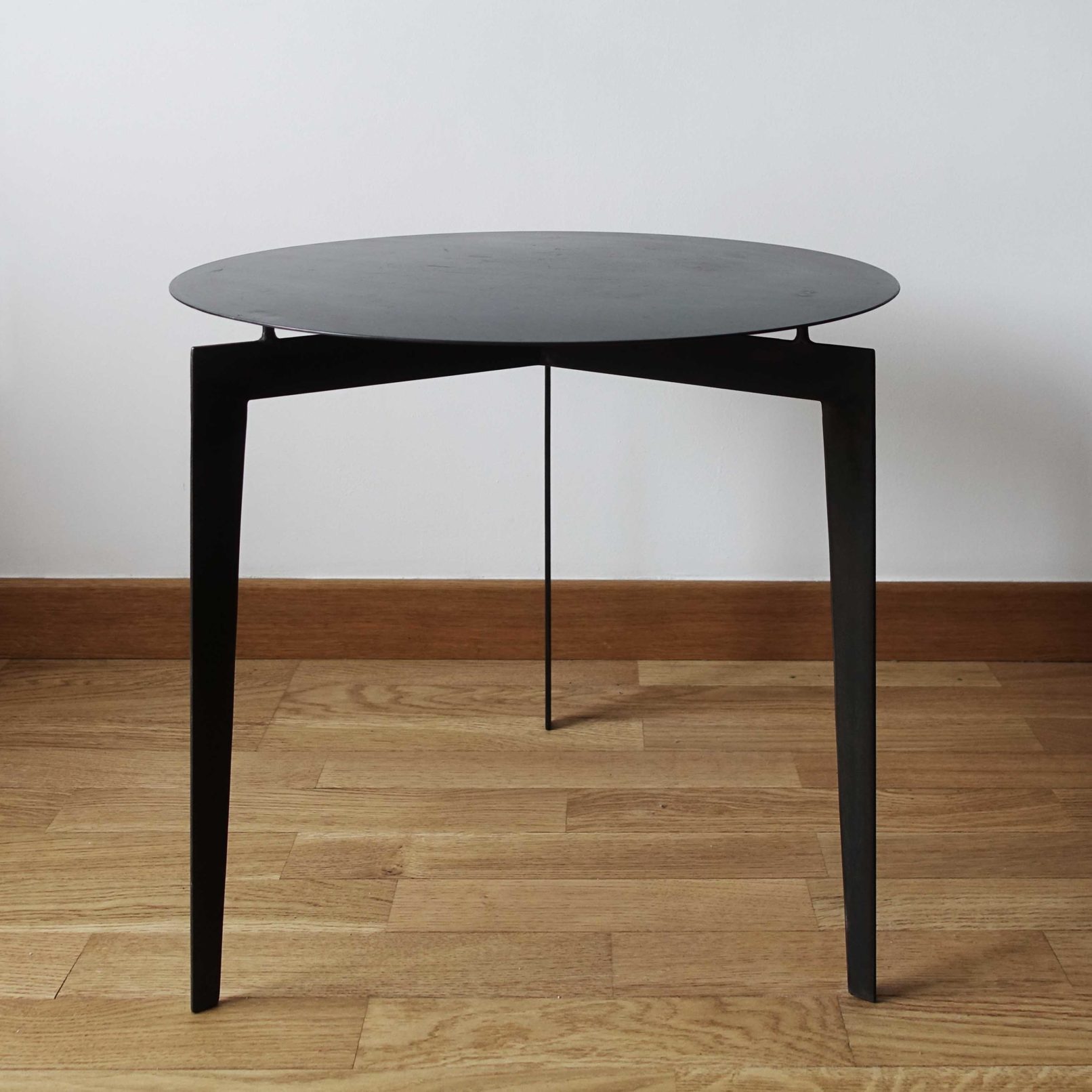 Table basse ronde en acier patiné.