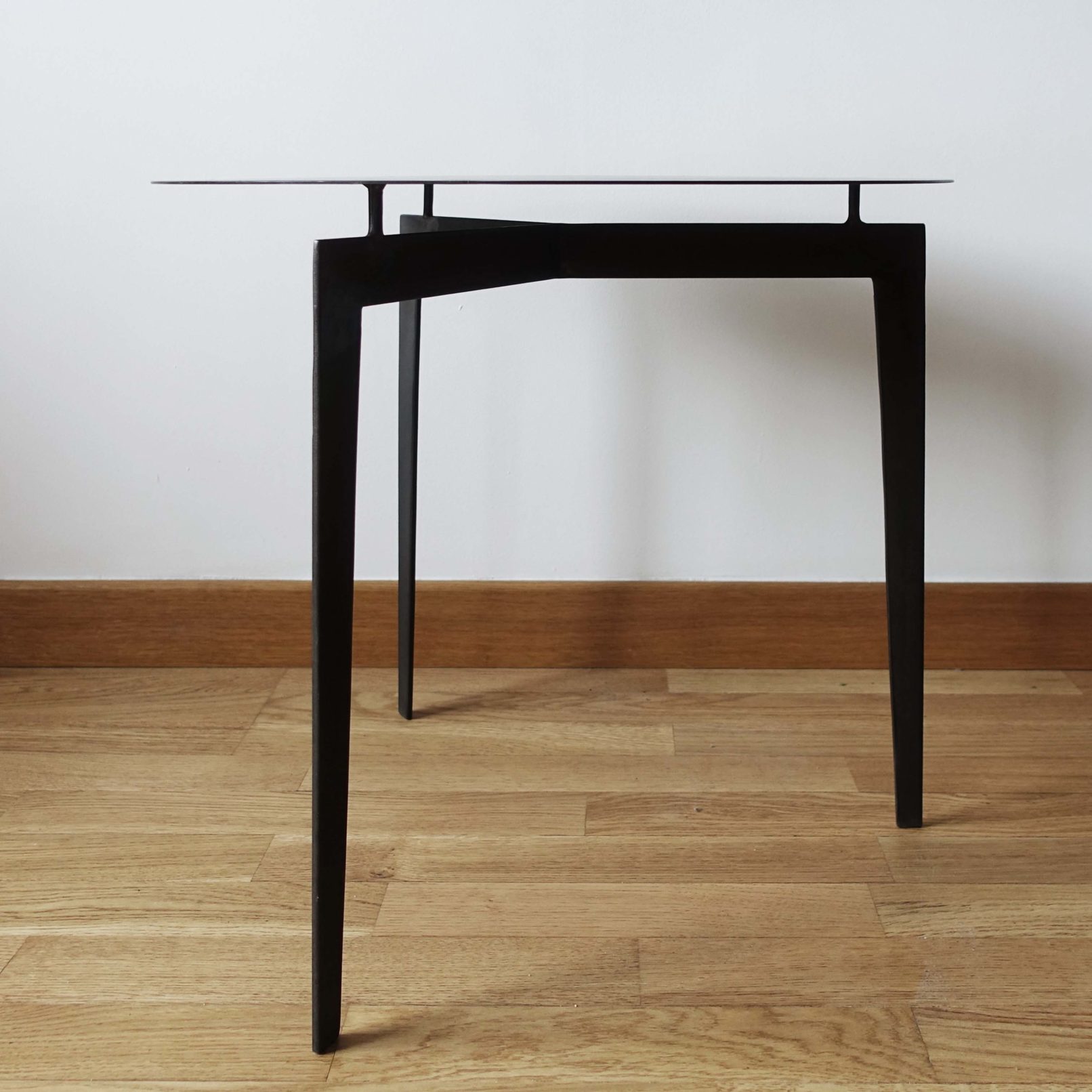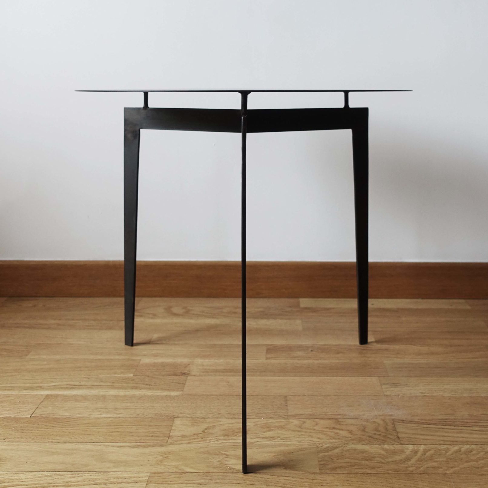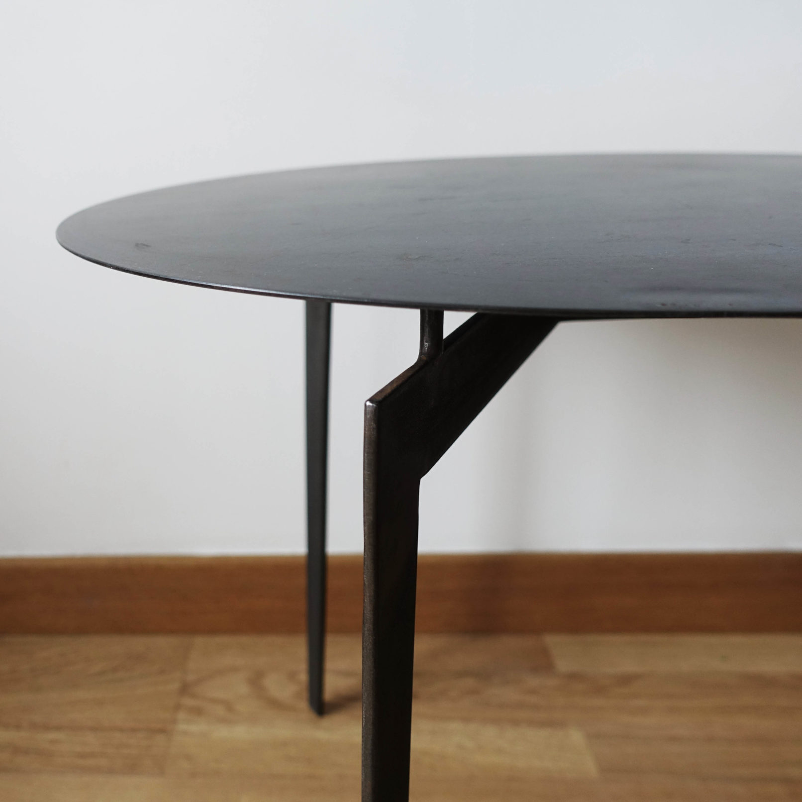 Table basse ronde en acier patiné.